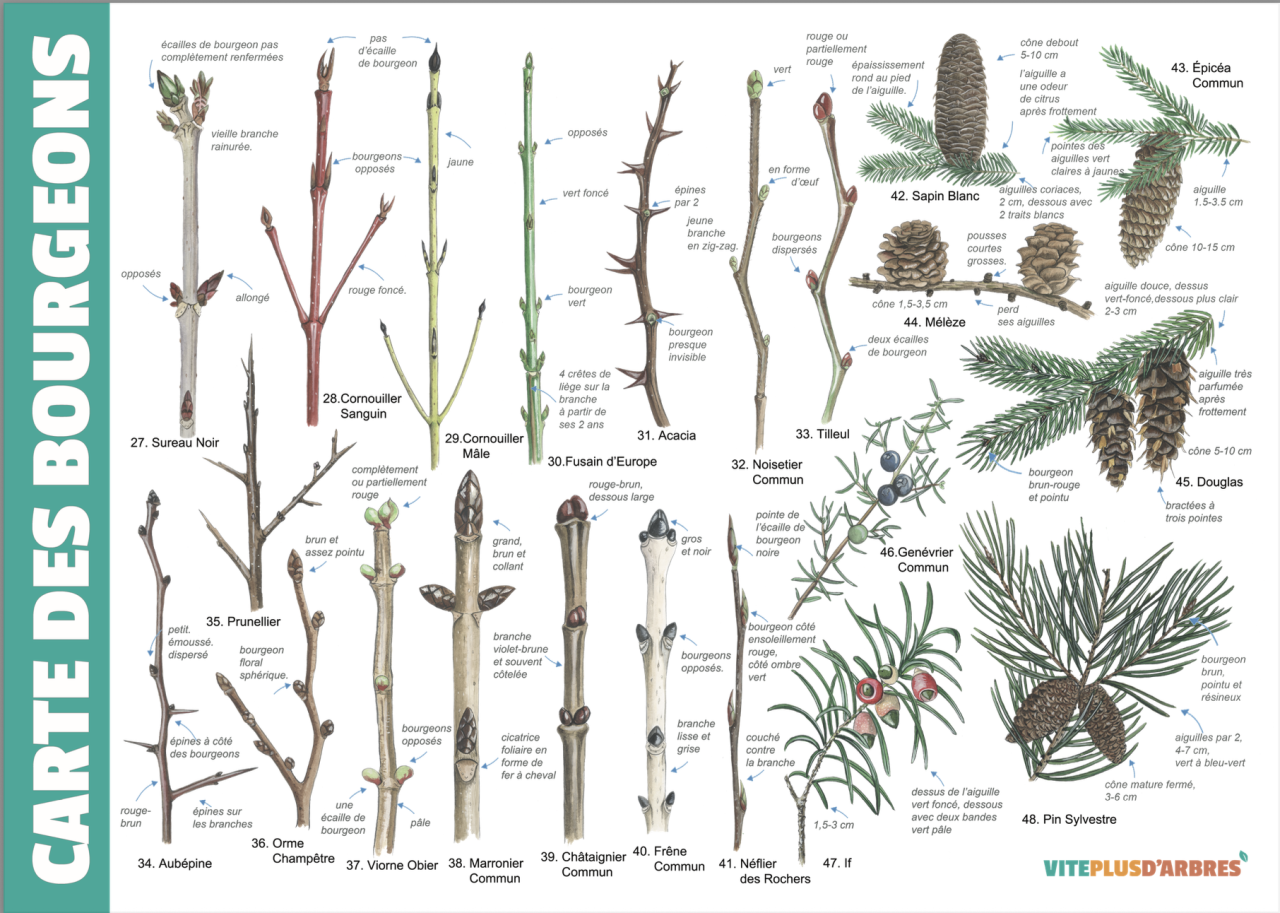 L’observation ne permet généralement pas d’identifier immédiatement la bonne espèce. C’est pourquoi nous utilisons une carte des bourgeons lors de nos journées de récolte. Cela peut être très utile. Imaginez que vous vous trouviez dans votre jardin et que vous ne puissiez plus distinguer votre arbre fruitier, que vous avez soigné avec amour, du châtaignier sauvage qui a poussé à côté… Téléchargez la carte des bourgeons. Si vous n’arrivez pas à l’identifier, l’application PlantNet peut également vous aider à le reconnaître.